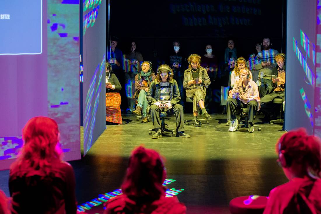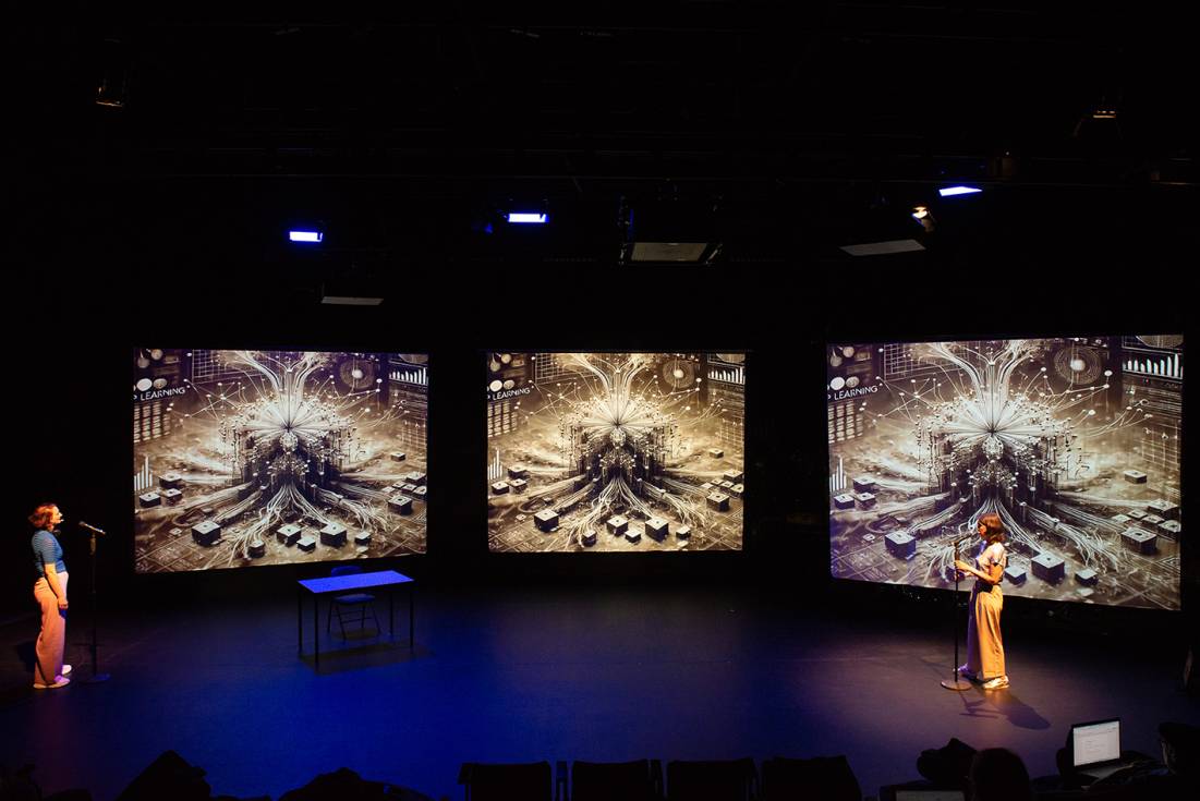 AI DEMOCRACY verwandelt die Bühne in eine digitale Polis: Polit-Bots, Deepfakes und KI-Wahlkampagnen treffen auf antike Entscheidungsfindungen. Zwischen Performer:innen, Publikum und einem Creative Coder entsteht ein Live-Experiment über Manipulation, Teilhabe und die Zukunft der Demokratie.