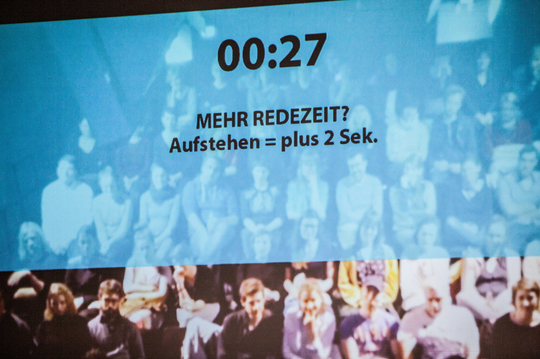 AI DEMOCRACY kann wahlweise auf Deutsch oder Englisch performt werden.