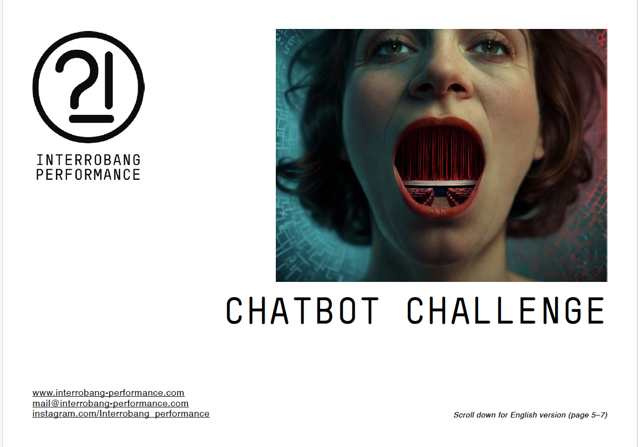 Ein tatsächlichen Auftritt KI als eine Figur des Theaters erlebt man erst in „Chatbot Challenge“ der Gruppe Interrobang..(…). Die Performerin leiht einem Chatbot ihren Körper, versucht eine Brücke zu sein für eine physische Präsenz, die die künstliche Intelligenz nicht kennt. (…) Urkomische Effekte entstehen bei dem Versuch der künstlichen Intelligenz Wege in die menschliche Emotionalität zu ebnen. Seit Jahren arbeitet die Performancegruppe mit Creative Codern, also kreativen Programmierern, daran, die in Kalifornien vorgestanzten Algorithmen und trainierten neuronalen Netzwerke für künstlerische Abenteuer fit zu machen, mit manchmal erschreckenden Ergebnissen (…). Ethikfilter sind auch der Grund, warum das System nicht auf alle Vorgaben reagiert, die ihm im Verlauf des Abends von der Performerin auf der Bühne gemacht werden. Ein äußerst komplexes Computerverfahren, generiert aus den Videobildern von der Bühne und den Prompts, genannten Stichworten, einen Videostream. Er soll physische und virtuelle Präsenz zu einem gemeinsamen Theaterereignis verschmelzen.